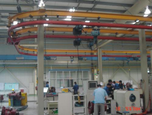 該設(shè)備適用于物料(工件)的線性輸送,根據(jù)用戶對物料輸送的傳遞、分配要求,可以組合成直線的、環(huán)形的、分岔的等多種形式的單軌輸送線網(wǎng)絡(luò)。通過采用直線、彎軌、道岔、轉(zhuǎn)盤實現(xiàn)軌道上輸送物料的任意走向。實現(xiàn)往返輸送作業(yè)和環(huán)形輸送作業(yè)。輸送線長度不受限制,可以是簡單的手動控制直線環(huán)形軌道、也可以是多分支的半自動或全自動控制的環(huán)形軌道,并可以實現(xiàn)全線供電、也可以實現(xiàn)分段供電,使每一個運行小車均成為自行驅(qū)動行走的輸送單元。